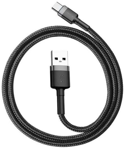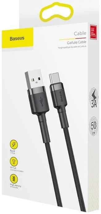 Baseus Cafule is a high quality USB Type C cable, designed for data transmission and device charging. The reinforced construction provides increased resistance to breaking (additional protection on the cable at the plug, and a thicker braided sleeving only available in the Cafule version). Additionally, materials reinforcing the structure of the plugs (e.g. aluminum) were used in the construction.