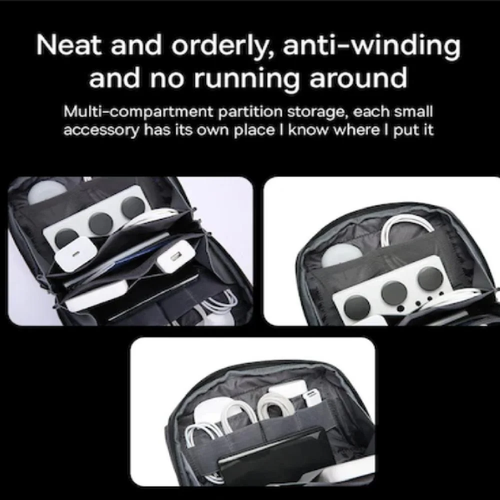 Ultimate Organization: Multiple compartments and elastic loops to keep chargers, cables, and other tech accessories organized. Water-Resistant Protection: Made from water-repellent materials to protect your electronics from spills and moisture. Shockproof Design: Features a shock-absorbing layer to safeguard your devices from bumps and drops. Compact & Portable: Lightweight and compact, this pouch is perfect for travel and easily fits into backpacks or suitcases. Functional & Versatile: Doubles as an electronics organizer, cosmetic bag, or wash bag, offering versatile use for all your needs.