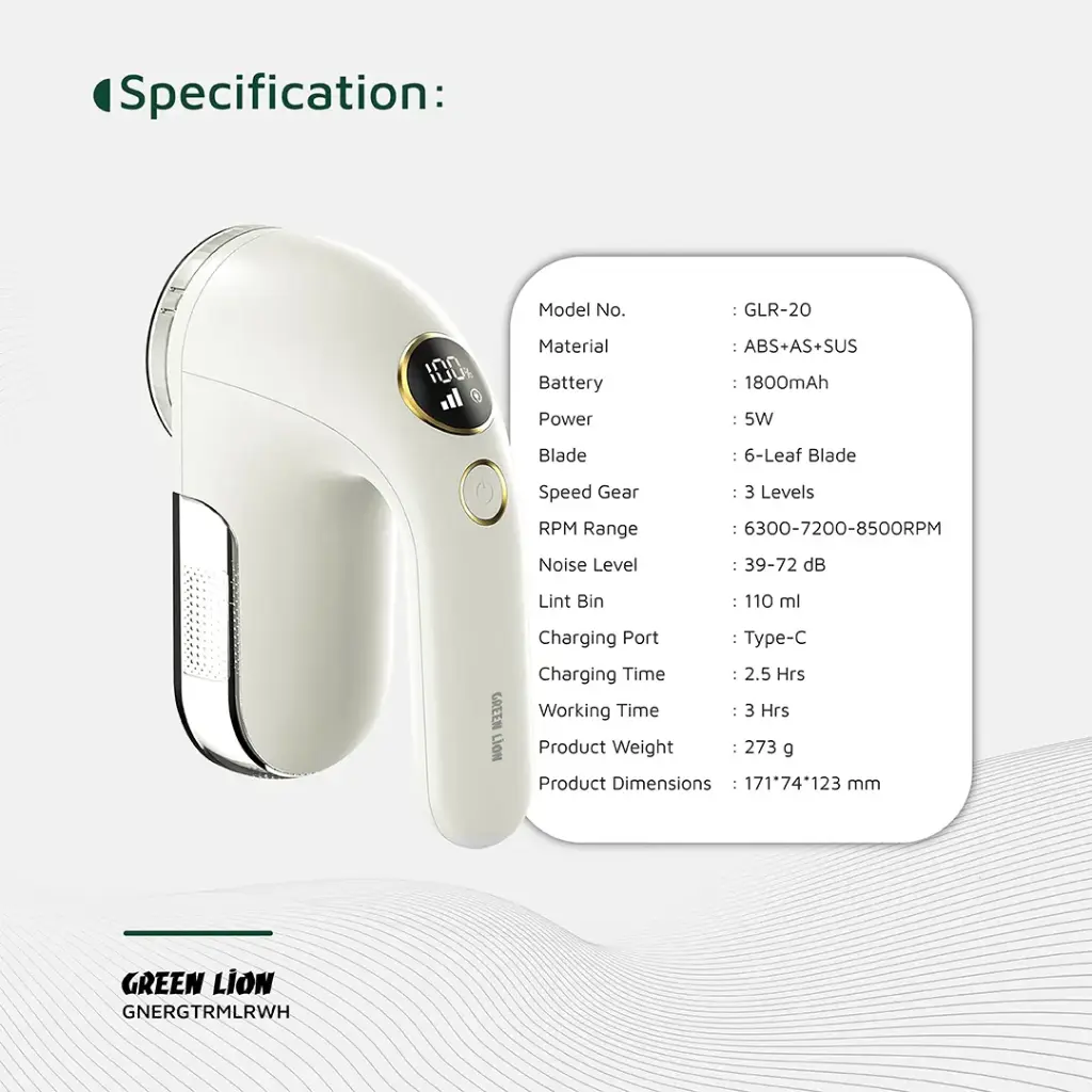The Green Lion ErgoTrim Digital Fabric Remover is practically designed to keep clothes looking fresh. It is made of ABS, AS, and SUS with a 6-leaf blade that easily eliminates lint, fuzz, and pilling from the fabrics. It comes with a 1800mAh battery, enabling it to be used for 3 hours continuously on a full charge. The device has 3-speed settings from 6300 to 8500 RPM, allowing you to alter the power as per your fabric needs. The ergonomic handle ensures comfort while operating; the honeycomb mesh cover protects the fabric. Emptying the 110mL lint bin is simple, while the digital display keeps you informed about battery levels and settings. Thanks to Type-C charging and a charging time of 2.5 hours, it's travel-friendly and ready upon demand. Great for prompt and fuss-free fabric care.